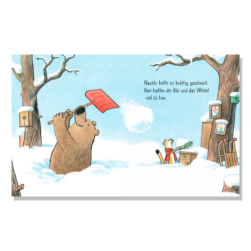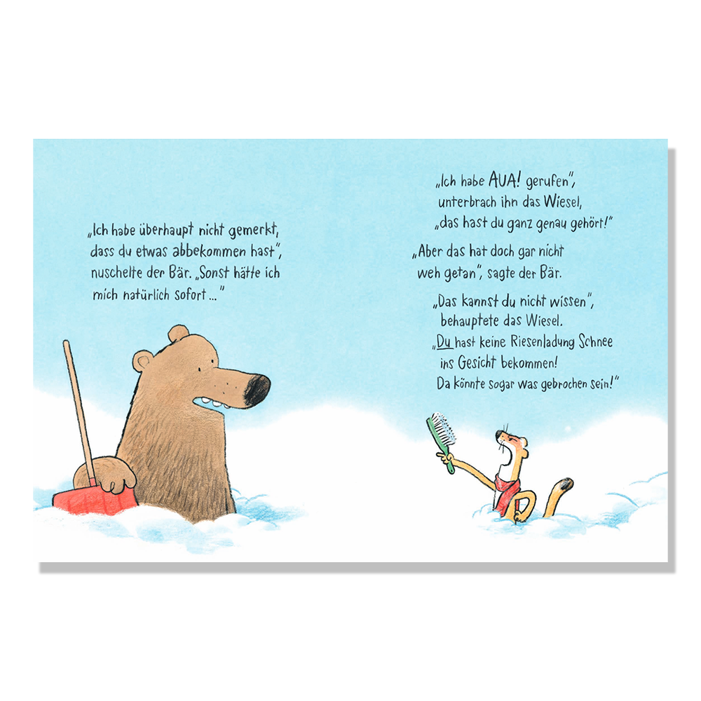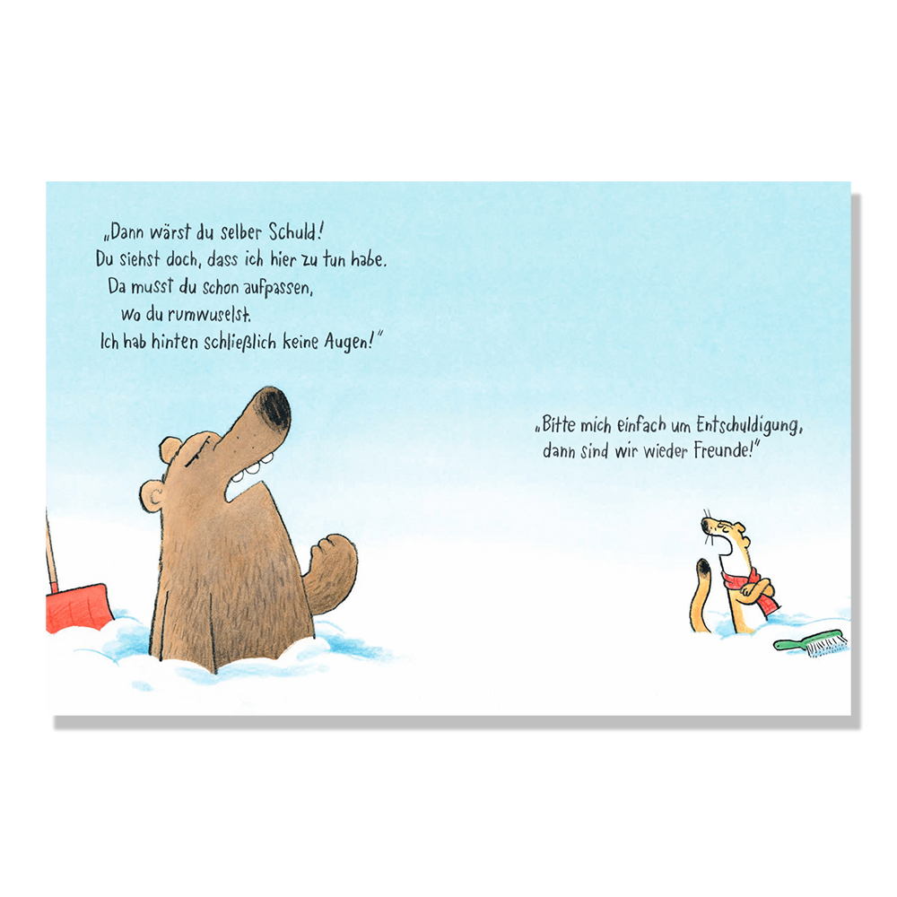 Bär und Wiesel haben viel zu tun, denn nachts hat es kräftig geschneit und sie müssen Schnee schippen! Als Bär Wiesel - versehentlich? - mit Schnee bewirft, verlangt Wiesel eine Entschuldigung. Doch Bär brummt nur: "War doch keine Absicht." Das lässt Wiesel nicht gelten, aber Bär beharrt: "Ich hab hinten schließlich keine Augen!" Nun stellt sich die Frage, ob Um-Entschuldigung-bitten schwer ist. "Danach fühlst du dich gleich besser!", meint Wiesel. Und tatsächlich: Auf diese Weise kommt es zu einer wunderbaren Schneeballschlacht, bei der dann gar noch Fuchs mitmischen kann.