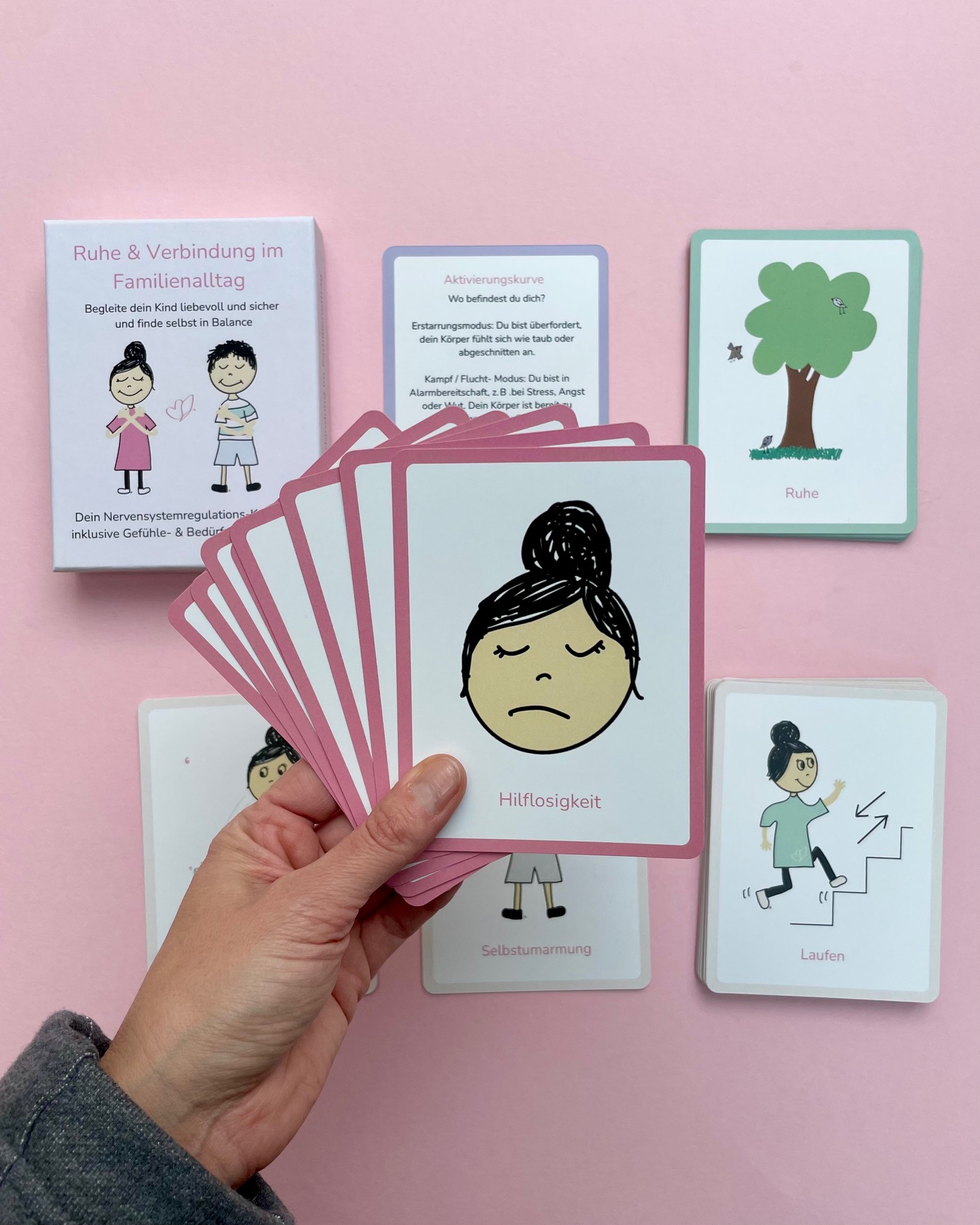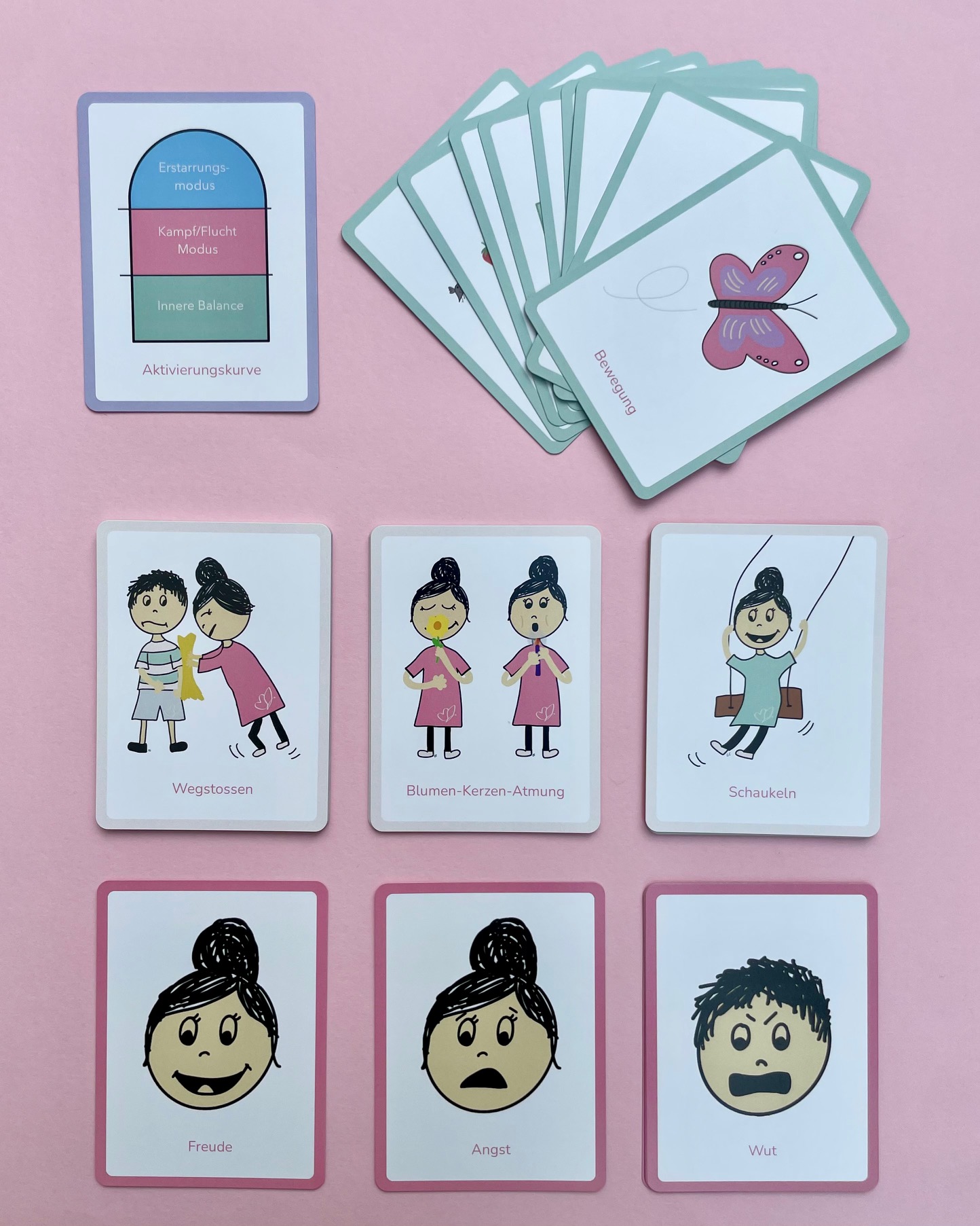 Das Set enthält gezielte Übungen zur Regulation bei verschiedenen Gefühlen wie Wut, Trauer, Angst oder Überforderung – körpernah, spielerisch und traumasensibel. Ausserdem lernt ihr eure Nervensystemzustände kennen und erkennt, was ihr tun könnt, um wieder in eure Mitte zu kommen. In kleinen, sicheren Schritten stärkt ihr eure Fähigkeit, euch selbst und einander zu verstehen, zu regulieren und mit herausfordernden Momenten einfühlsam umzugehen. Ein kraftvolles Lernfeld für emotionale Achtsamkeit, Selbstwahrnehmung, Resilienz und liebevolle Selbstfürsorge – für Gross und Klein.