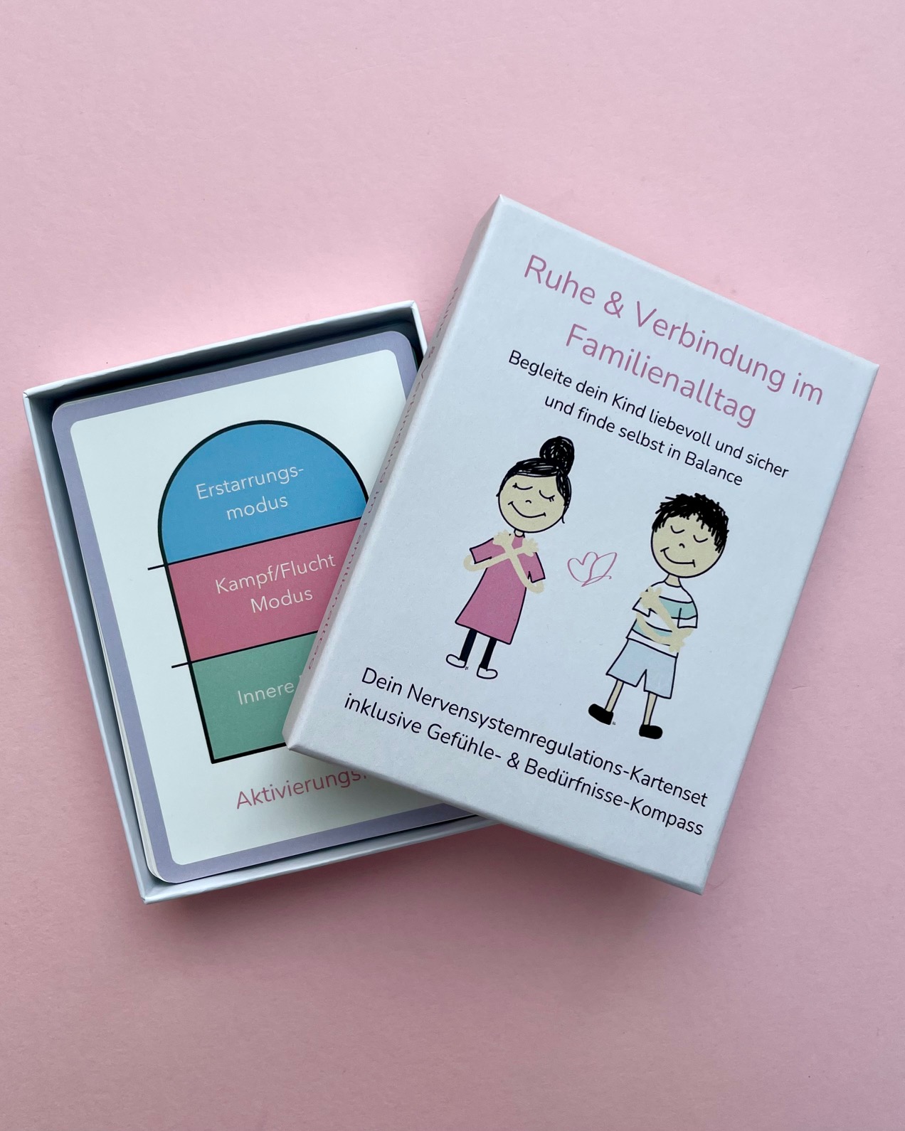 Das Nervensystemregulations-Kartenset inklusive Gefühle- & Bedürfnisse-Kompass von Herzlauschen ist ein feinfühliges Kartenset für mehr Sicherheit, Verbindung und Ruhe im Familienalltag. Mit liebevoll gestalteten Gefühlskarten, Bedürfniskarten, Nervensystemorientierungskarte und einfachen Regulationsübungen lädt das Set ein, achtsam wahrzunehmen: