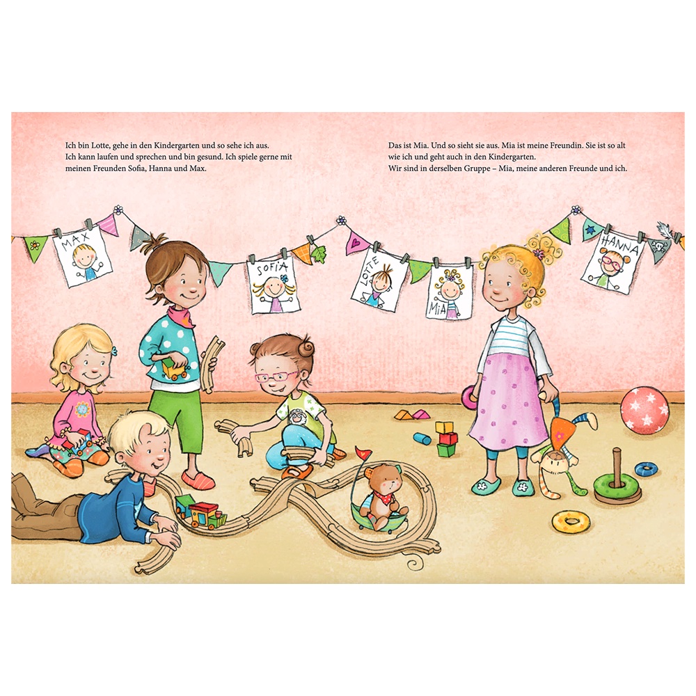 Ich bin Lotte. Und das ist Mia. Wir gehen in denselben Kindergarten. Mia ist ein bisschen anders. Manchmal kann ich sie nicht verstehen, und manchmal versteht sie mich nicht. Daher beobachte ich sie ganz genau und lerne so, wie Mia wirklich ist. Mia ist besonders. Und sie ist toll! - Mia ist besonders toll! Und daher ist Mia meine ganz besondere Freundin.