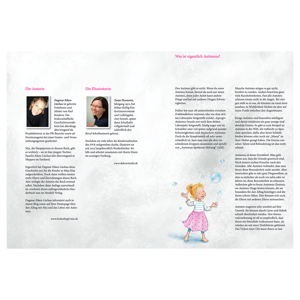 Diese Geschichte hilft, das Verhalten und die Gefühle von Kindern, die anders sind, besser zu verstehen - was manchmal gar nicht so leicht ist. Sie lehrt bereits die ganz Kleinen, wie schön es sein kann, andere zu entdecken und so zu akzeptieren, wie sie sind. So lernen Kinder im Kita-Alter, mit besonderen Kindern umzugehen und sie gelassen in ihre Gemeinschaft zu integrieren. Altersgerecht und situationsorientiert, ohne zu verurteilen oder zu beängstigen, klärt dieses Buch auf. Mia ist Autistin. Sie spricht nicht. Der Begriff "Autismus" kommt in der Geschichte nicht vor, wird aber im Anhang verständlich erklärt.