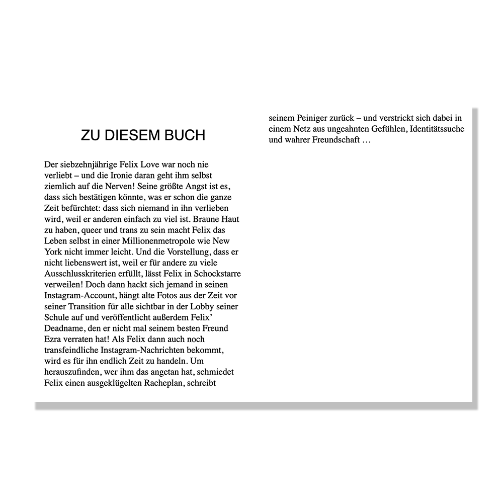 Der siebzehnjährige Felix Love war noch nie verliebt - die Ironie daran geht ihm selbst ziemlich auf die Nerven! Seine größte Angst ist es, dass sich niemand in ihn verlieben wird, weil er einfach zu viele Ausschlusskriterien erfüllt. Braune Haut, queer und trans - die Vorstellung, dass er deshalb nicht liebenswert ist, lässt ihn in Schockstarre verweilen. Doch als Felix transfeindliche Instagram-Nachrichten bekommt, nachdem sein Deadname zusammen mit Fotos von ihm vor seiner Transition in der Schule veröffentlicht wurde, wird es für ihn endlich Zeit zu handeln. Felix schreibt seinem vermeintlichen Peiniger zurück, um herauszufinden, wer ihm das angetan hat, und verstrickt sich dabei in einem Netz aus ungeahnten Gefühlen, Identitätssuche und wahrer Freundschaft ...